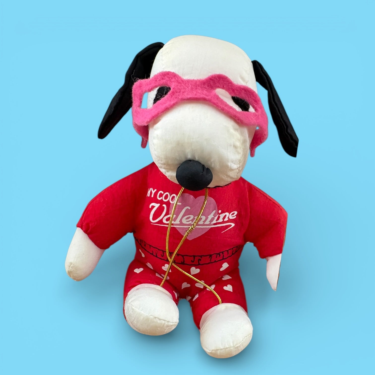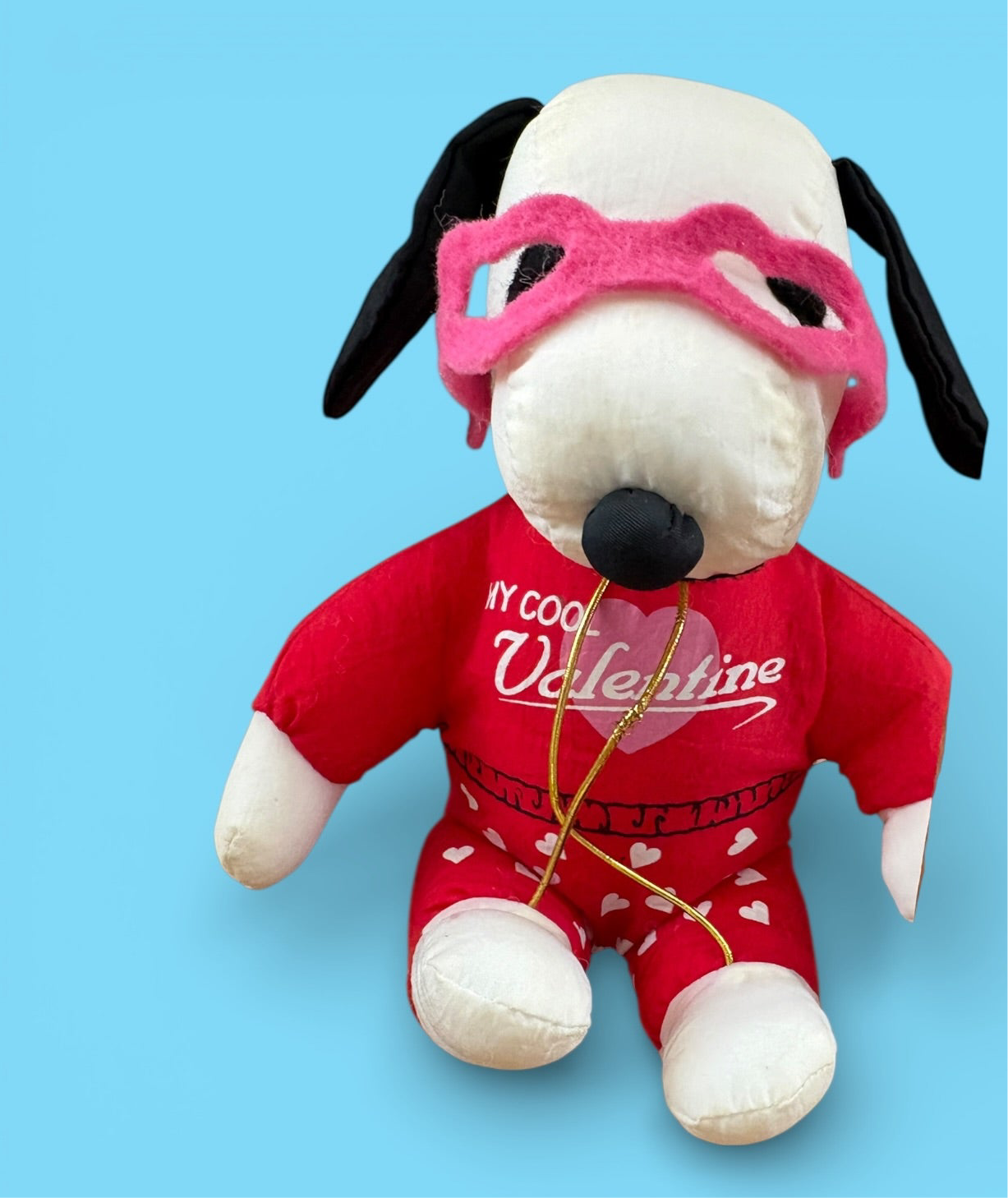 Snoopy dressed in a my cool valentine jumpsuit wearing a pink heart mask .